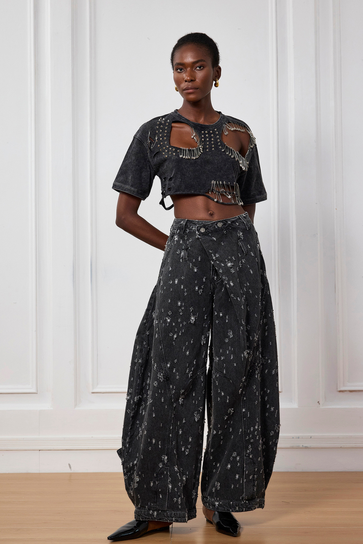 Experience the ultimate blend of style and comfort with our Ayah Torn Asymmetric Jeans. The unique design boasts an asymmetric cut, adding a touch of edge to your wardrobe. Made with high-quality materials, these jeans offer a flattering fit and long-lasting durability. Upgrade your denim game today.