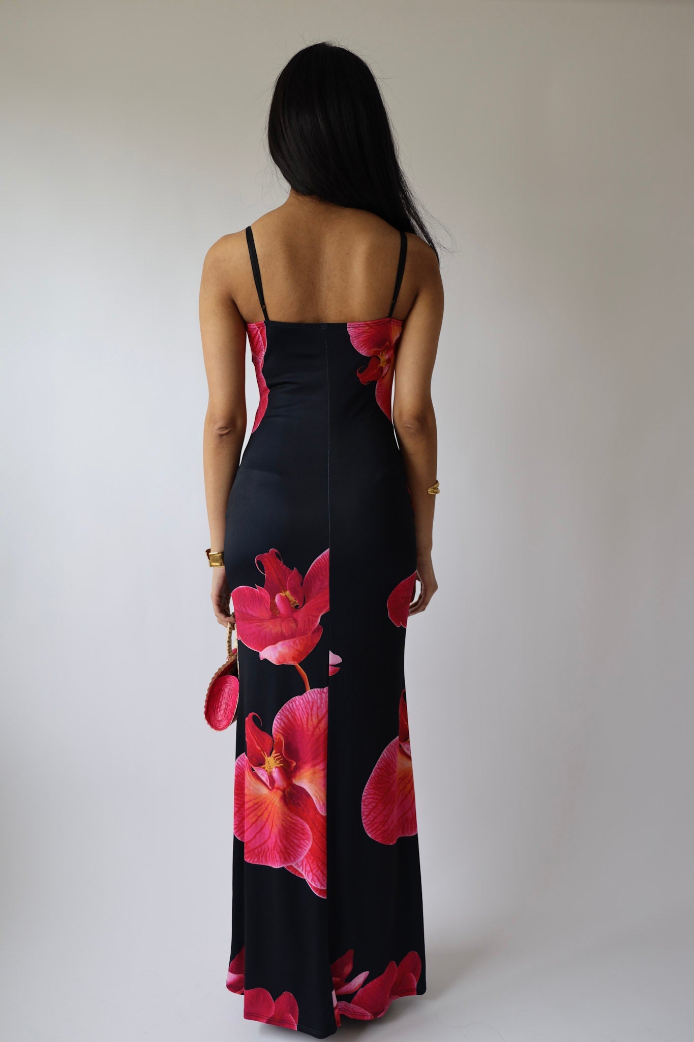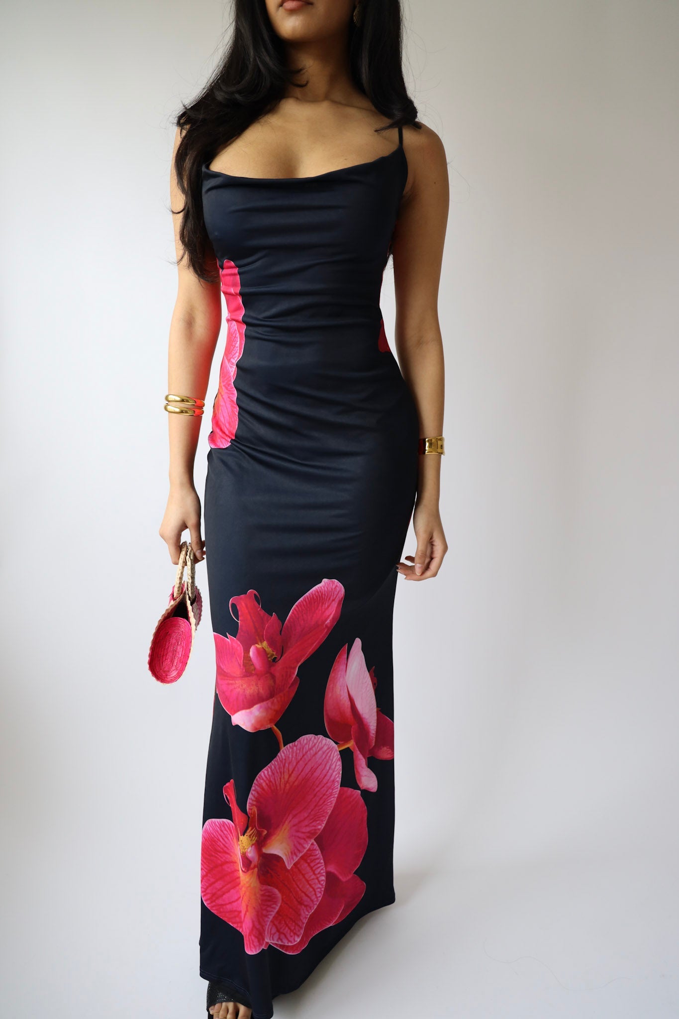 Bold blooms, effortless energy. The Orchid Bloom Slip Dress features a silky black base with vibrant pink orchid prints that bring instant drama. A flattering cowl neckline and body-skimming fit make it perfect for wedding guest season, tropical getaways, or date nights that call for a little extra wow.