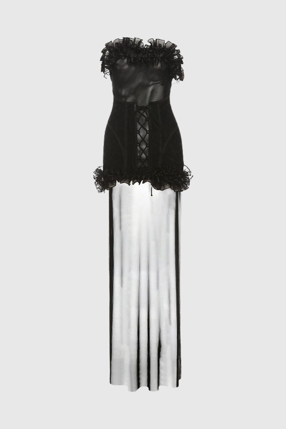 Begum Mesh Ruffle Lace Up Asymmetric Mini Dress