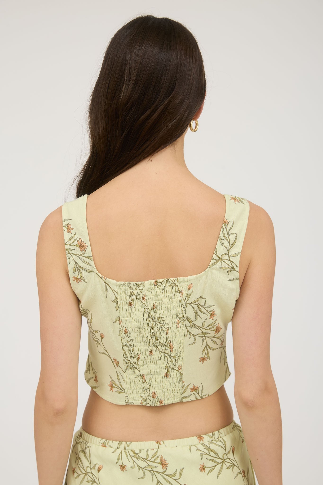 Tags: floral corset top, linen crop top, vacation set top, coastal fall fashion, pre-fall essentials, garden getaway outfit, botanical top, dreamy button blouse, feminine resort wear, transitional look