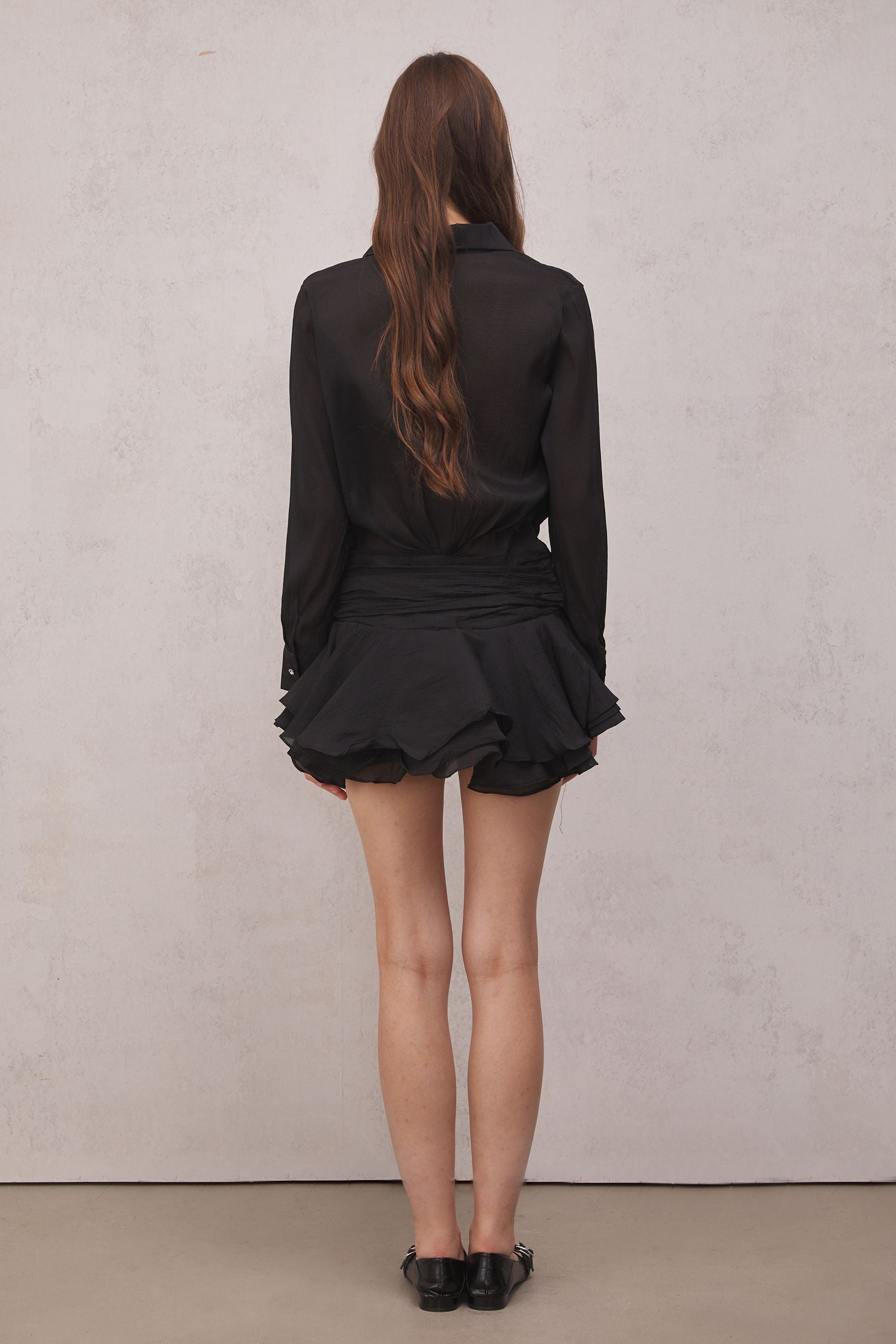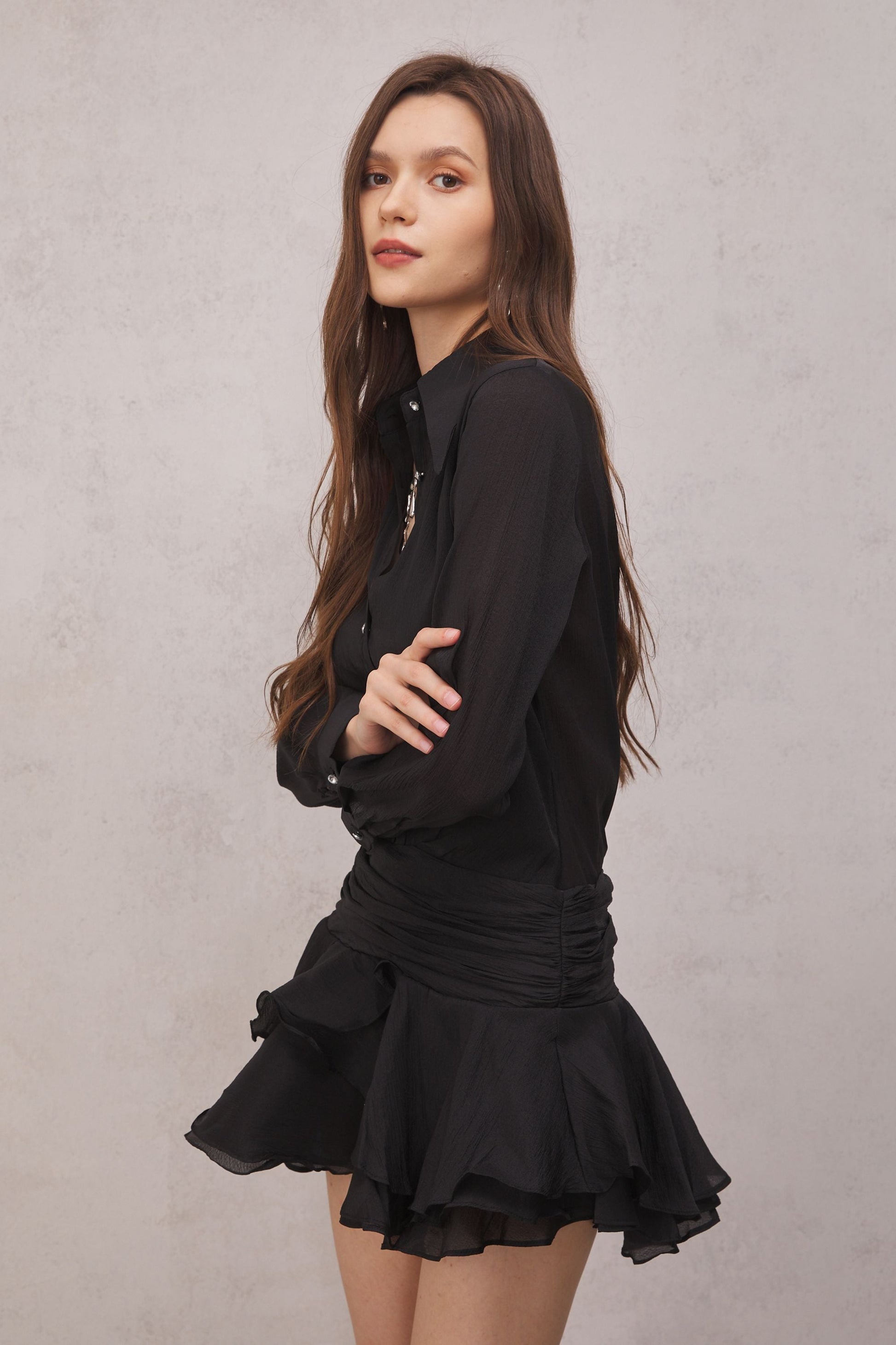 Introducing the Brinley Ruched Ruffle Mini Dress in Black. This stunning dress features ruched detailing and ruffle accents that add a touch of feminine flair to the classic black color. Made with high quality materials, this dress is both comfortable and stylish.