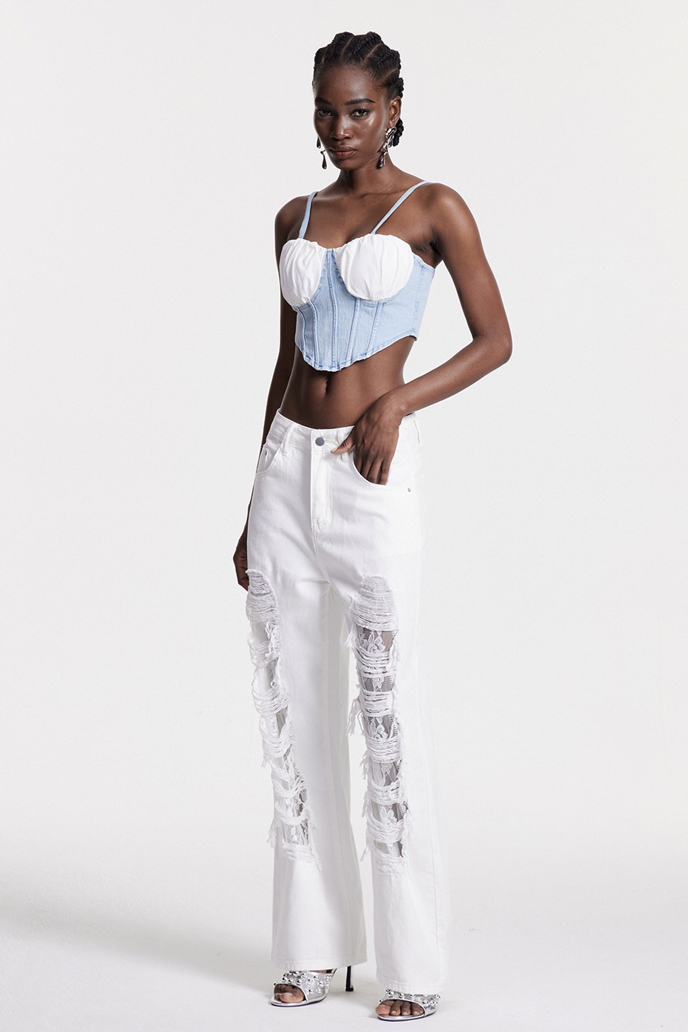 Chiyo Lace Ripped Jeans combine modern distressed style with delicate lace detailing, offering a unique blend of edgy and feminine aesthetics. Crafted from premium denim, these jeans ensure durability and comfort while the strategic rips provide a fashion-forward, worn-in look. The intricate lace inserts add a sophisticated touch, making them versatile for both casual and dressier occasions. Ideal for those who appreciate expert design and a distinctive style statement.