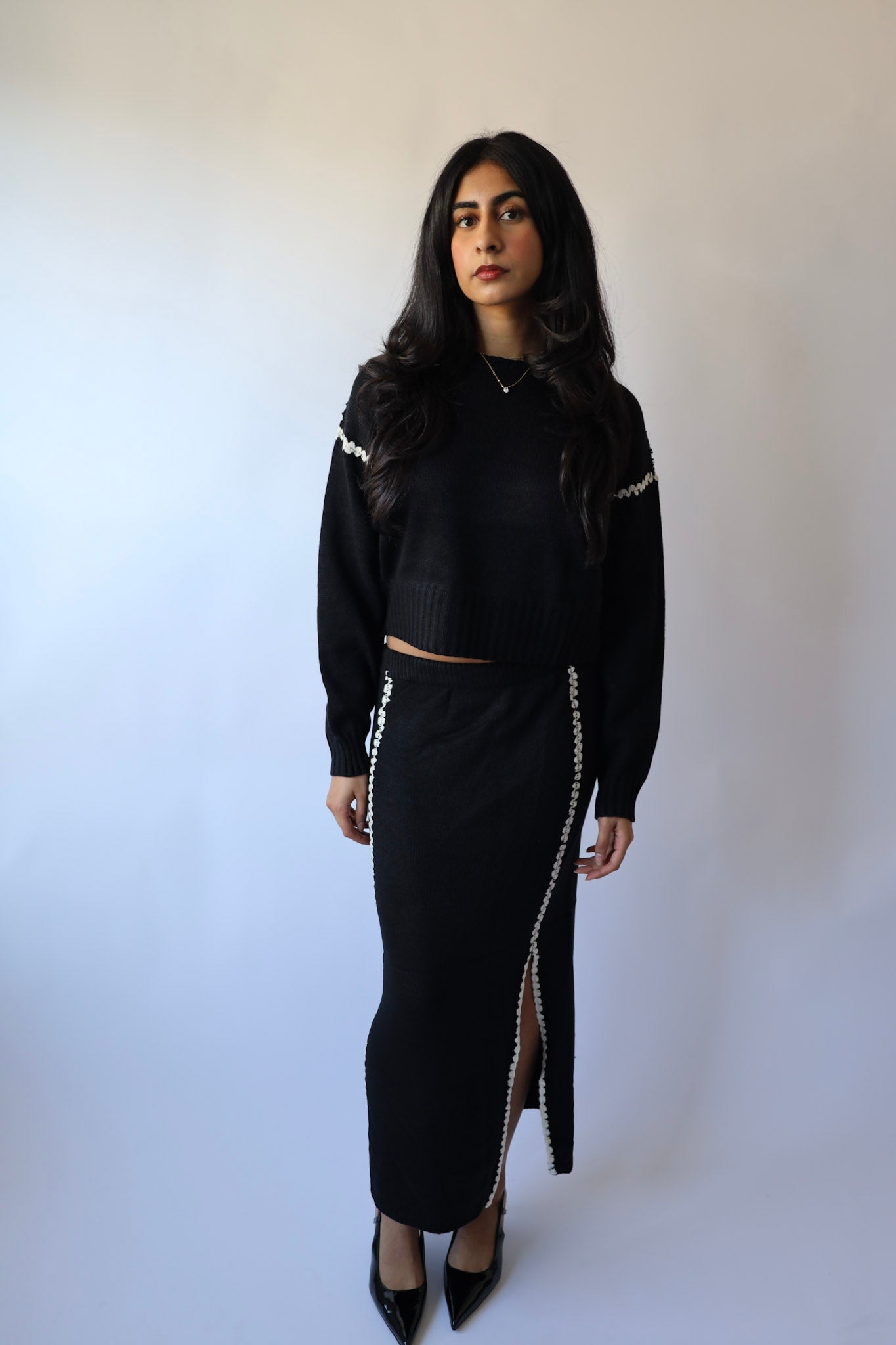 Playfully versatile, this fall set includes a contrast stitch knit sweater and long skirt with an elastic waistband and slit for added comfort and style. Dress up or down with ease!