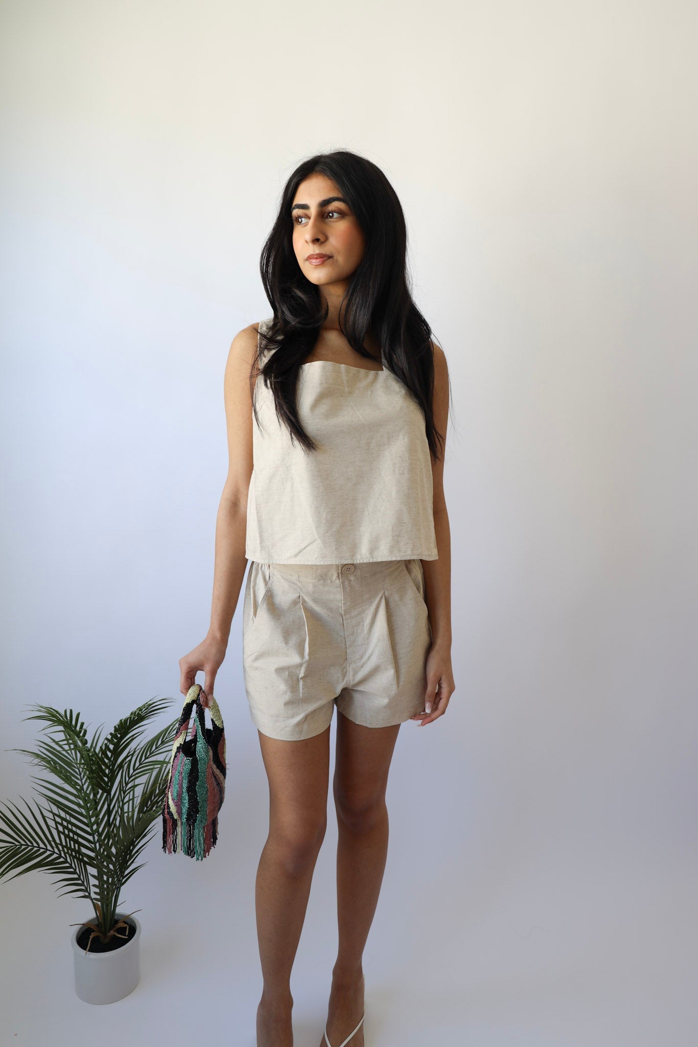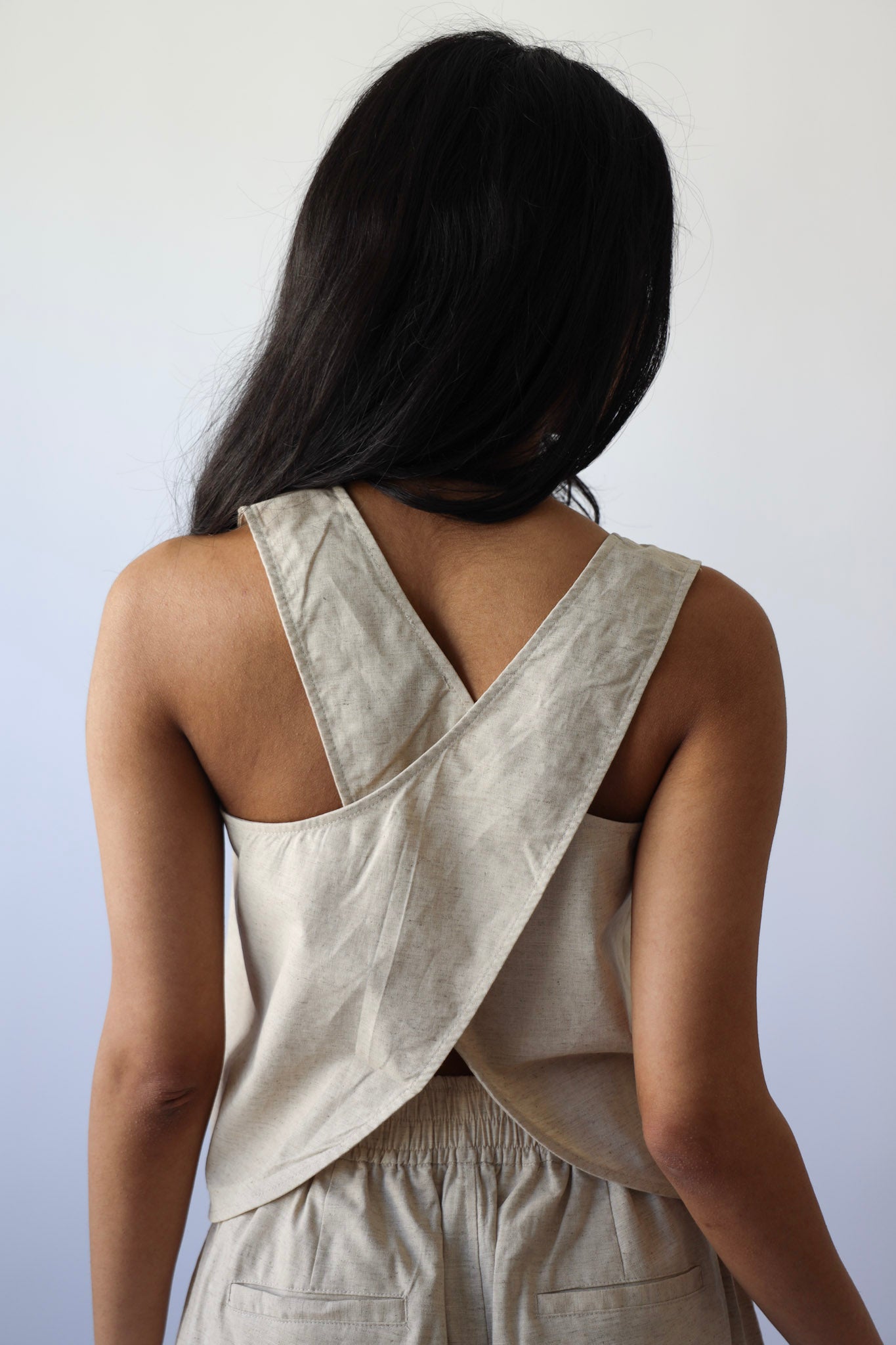 Get ready to turn heads on your next vacation with our Cream Crossed Back Linen Top! Its stylish design of a crossed back pairs perfectly with our matching shorts, making it the ideal outfit for any summer getaway. Made with high-quality cotton, this top is not only fashionable but also comfortable for all-day wear.