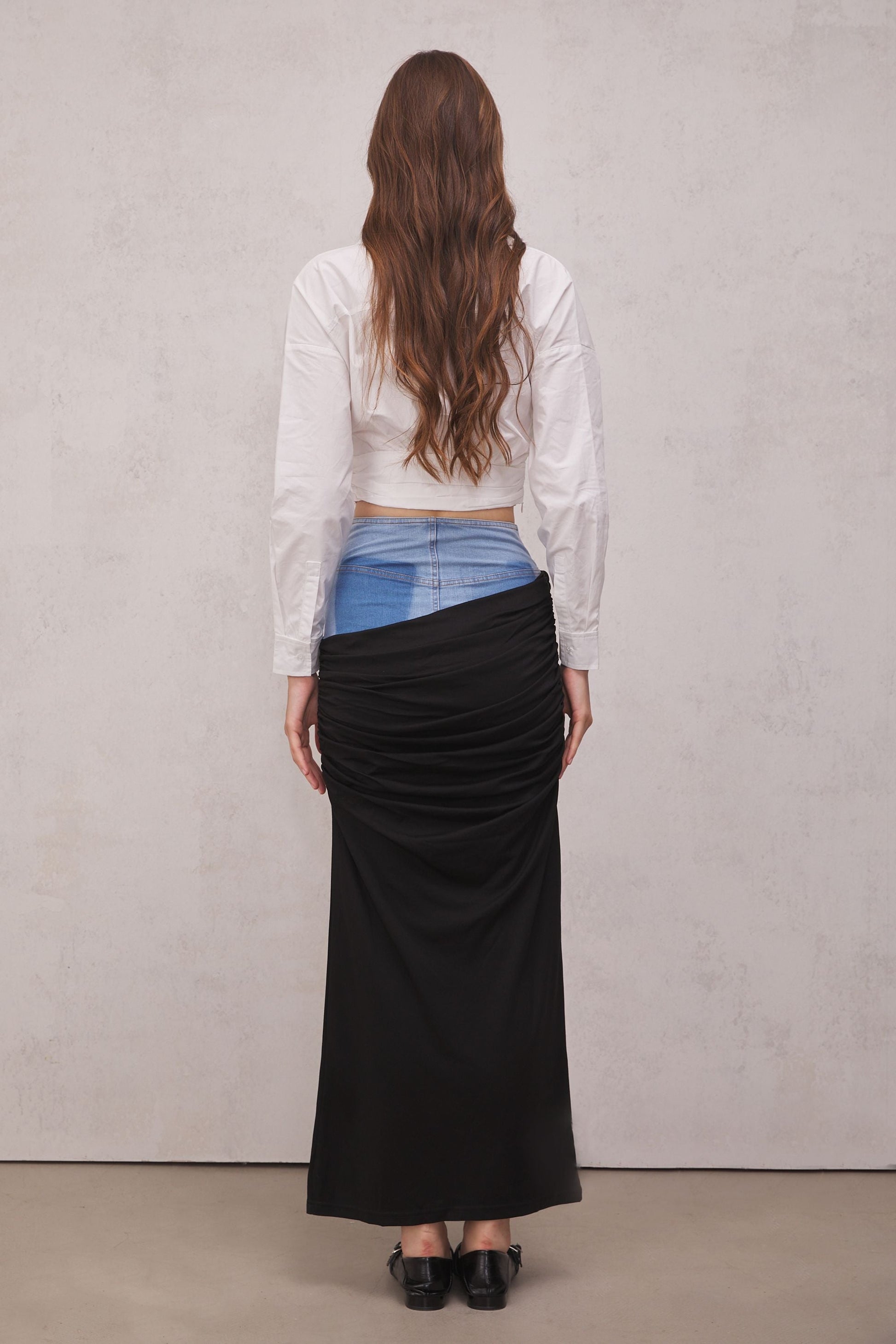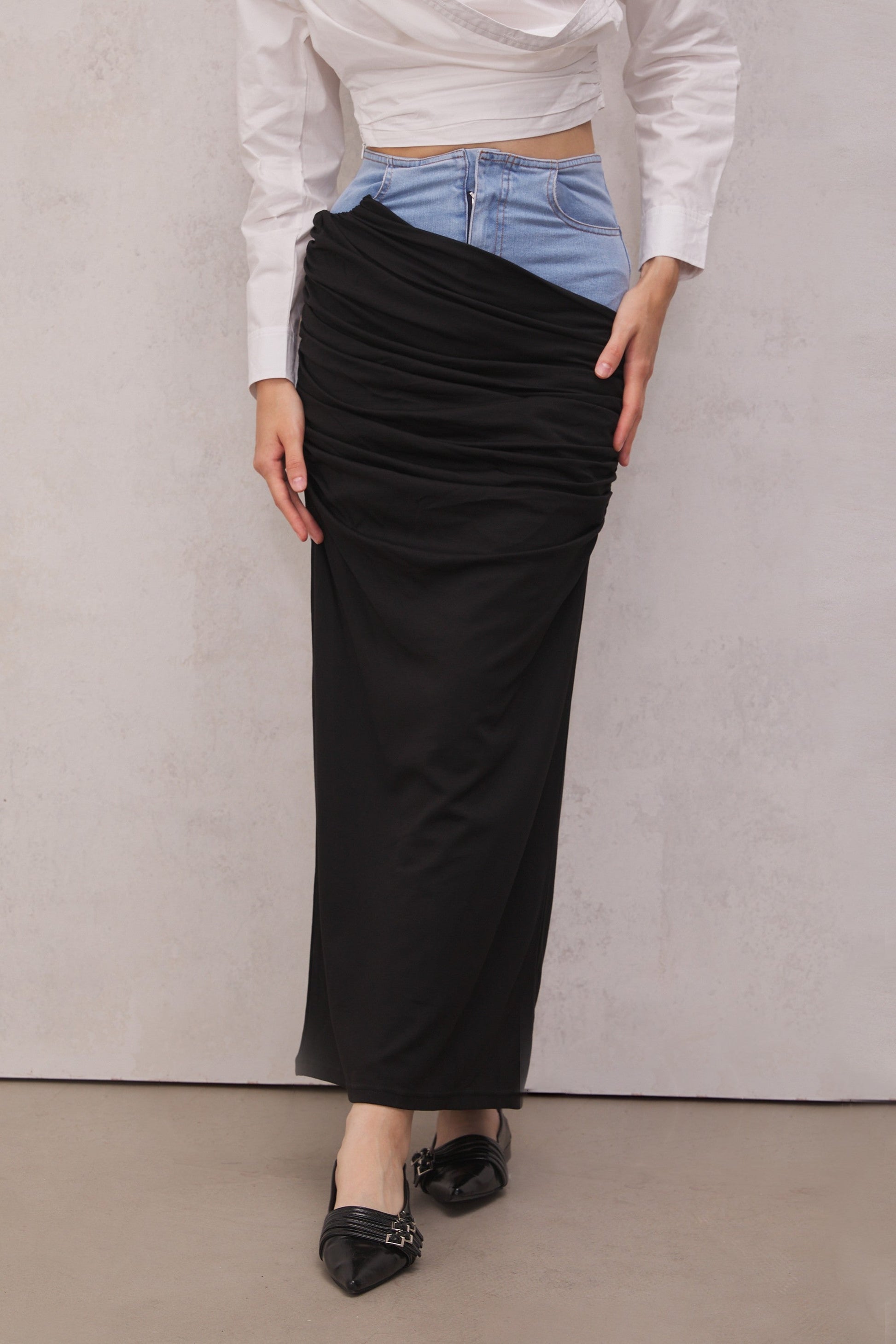 Experience the perfect blend of style and comfort with our Melody Draped Patchwork Denim Skirt. The unique patchwork design adds a touch of sophistication to this classic black denim skirt. Feel confident and stylish all day long. Order now, and elevate your wardrobe!