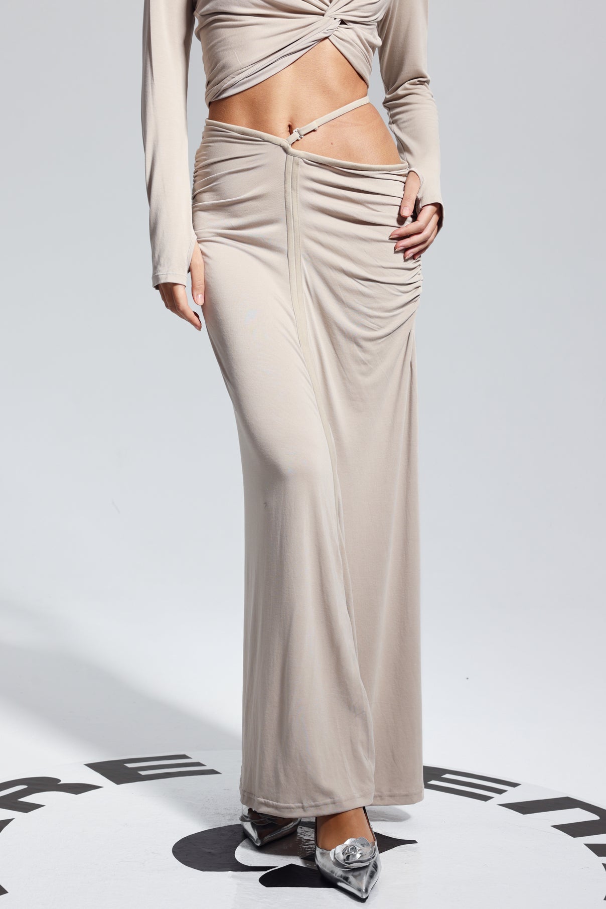 Crafted from soft and stretchy fabric, the Padget Ruch Cutout Bodycon Skirt is designed to hug your curves and enhance your silhouette. The elegant cutout detail adds a touch of sophistication to this stylish apricot-colored skirt. Perfect for a night out or a special occasion, this skirt will make you feel confident and chic.
