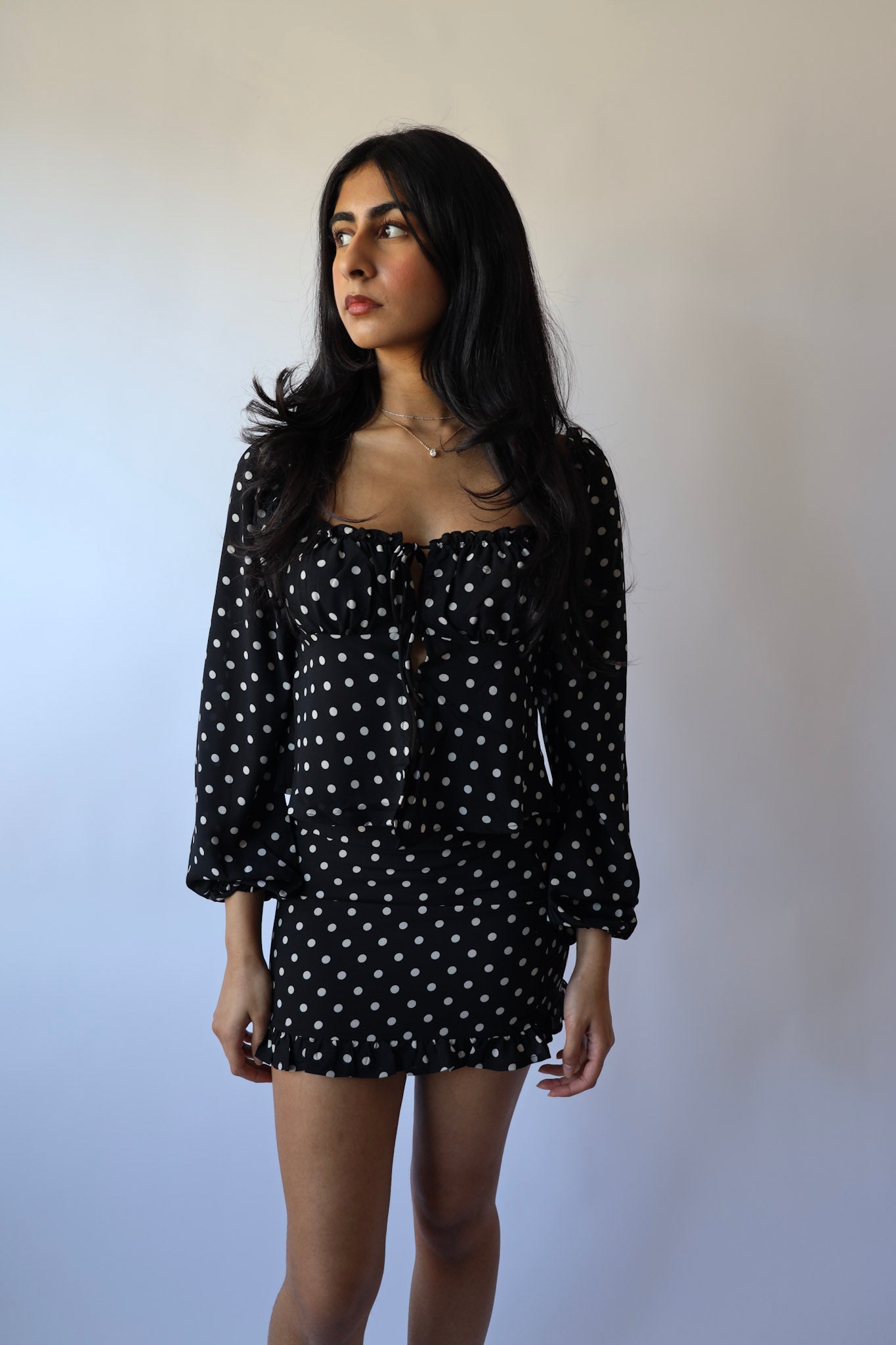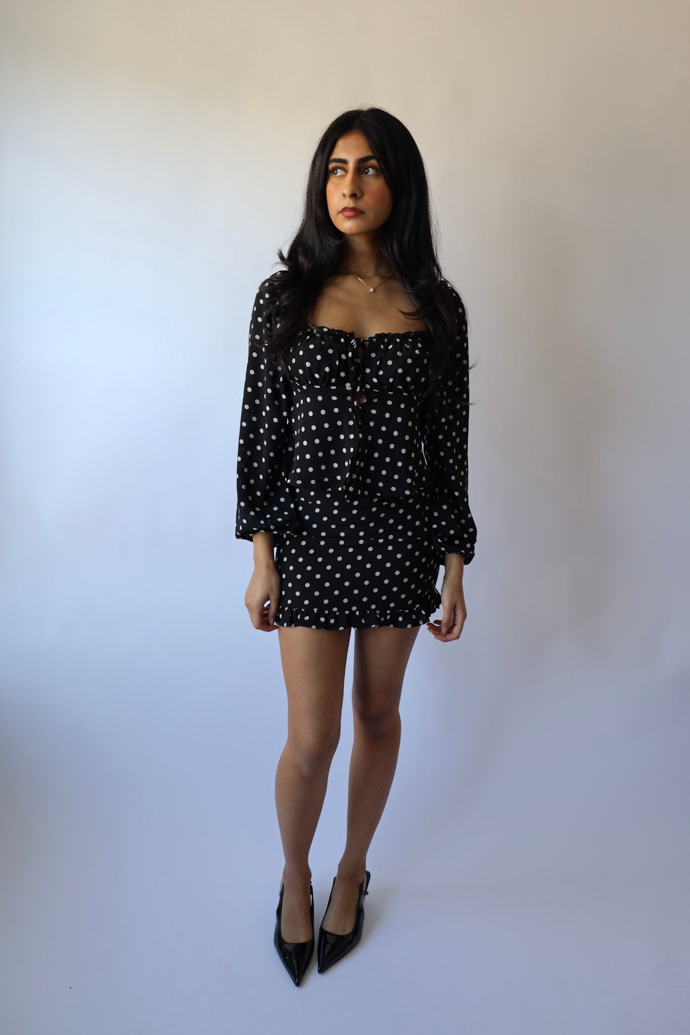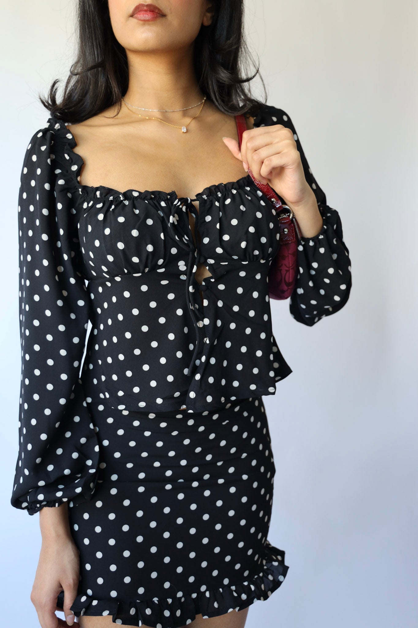 Get ready to turn heads with our Y2k-inspired Polka Dot Baby Doll Long Sleeve and Mini Skirt set. Perfect for a night out, this black and white outfit is sure to make a statement. So go ahead, be a little extra and stand out from the crowd!