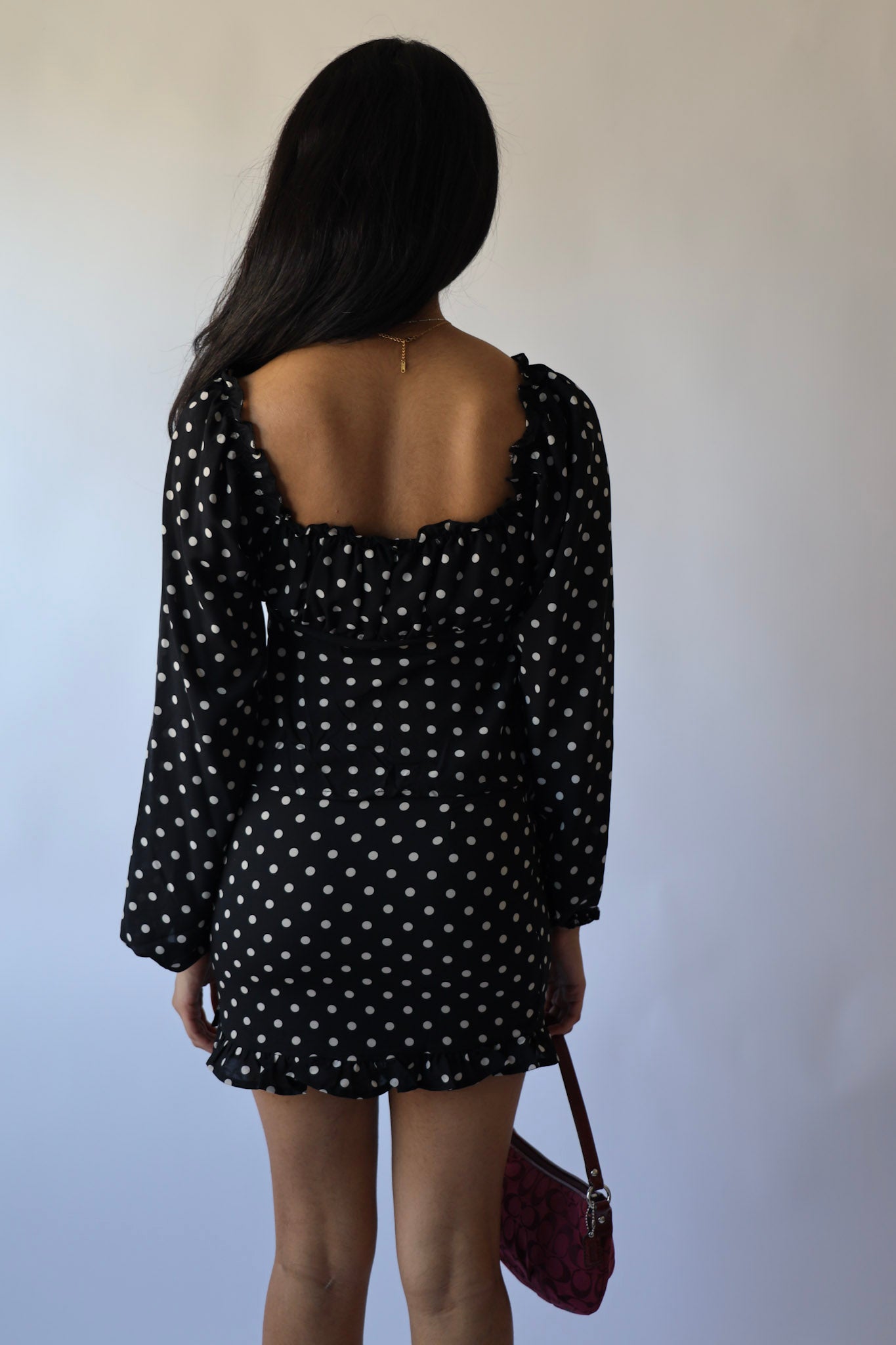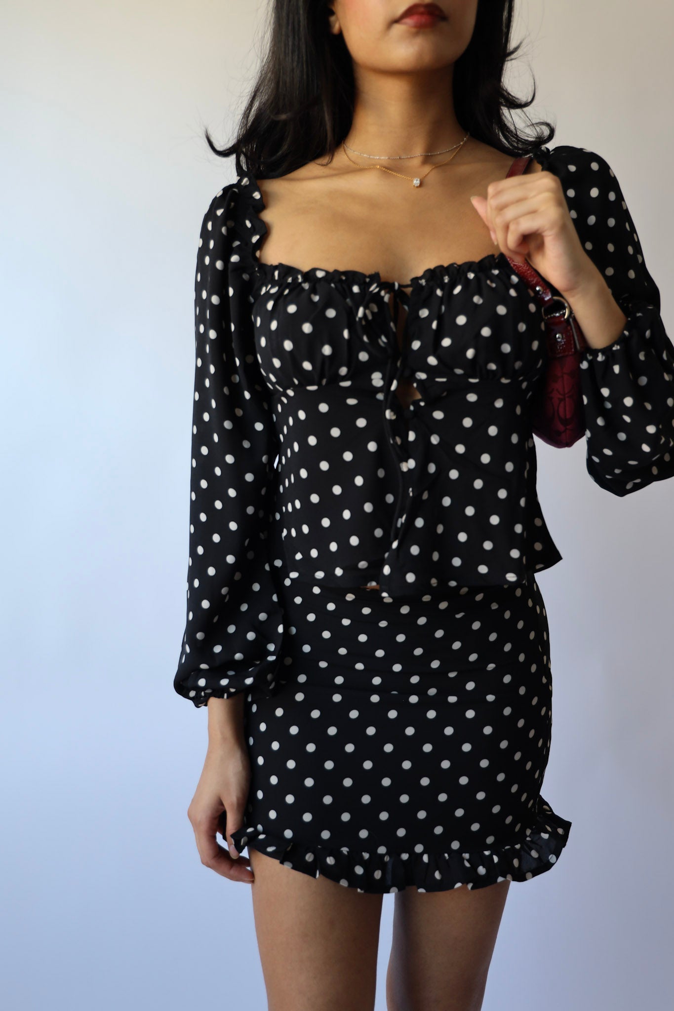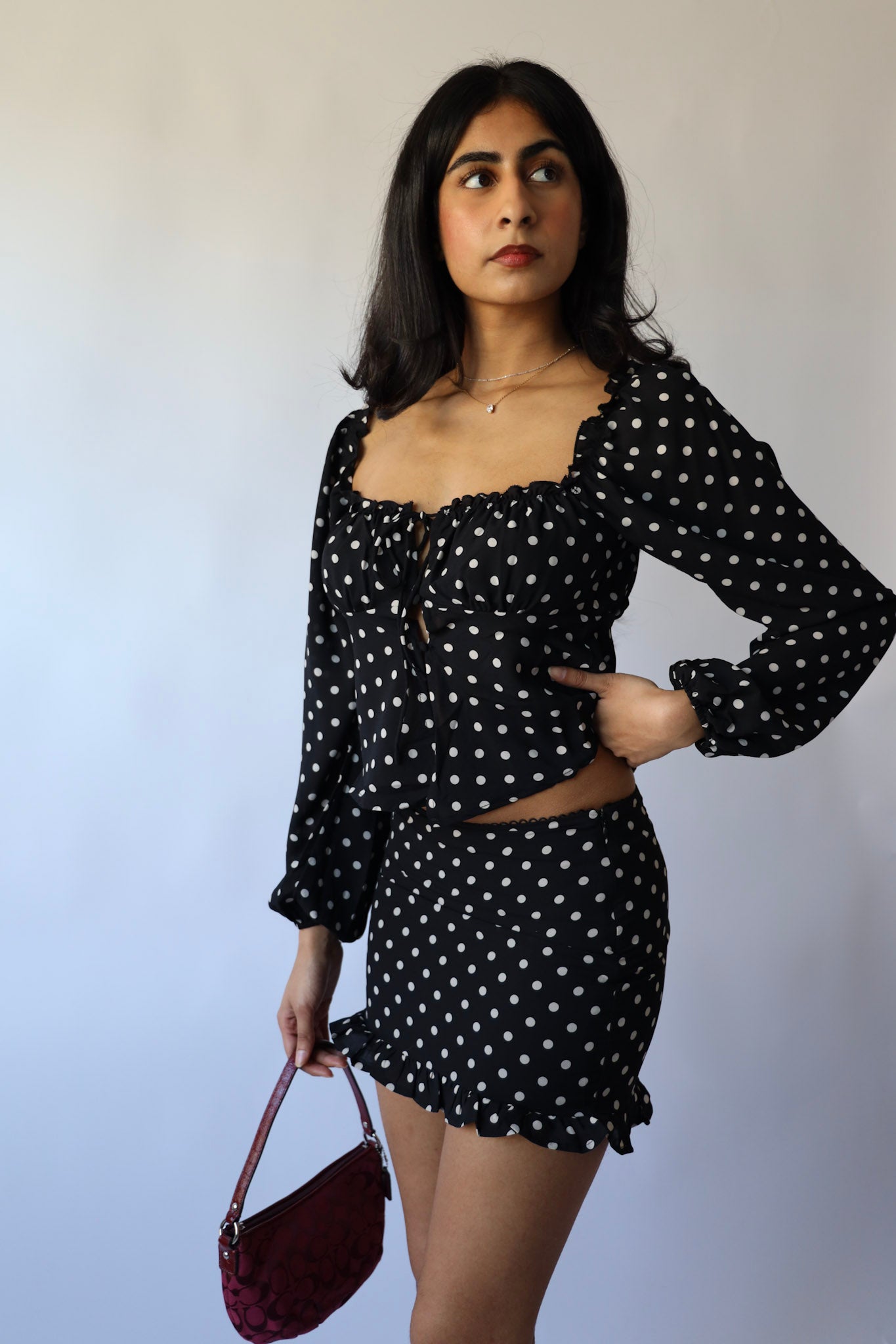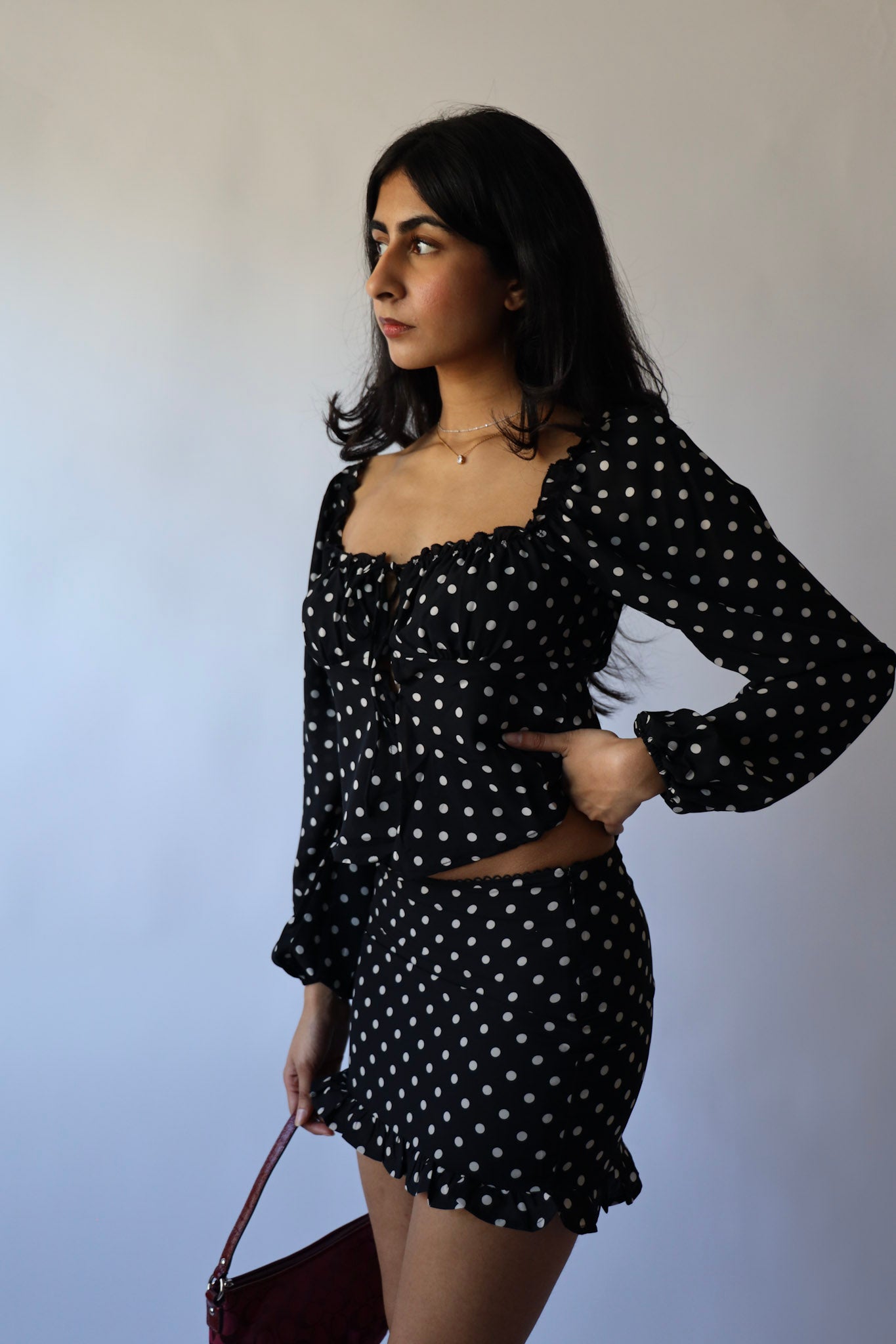 Get ready to turn heads with our Y2k-inspired Polka Dot Baby Doll Long Sleeve and Mini Skirt set. Perfect for a night out, this black and white outfit is sure to make a statement. So go ahead, be a little extra and stand out from the crowd!