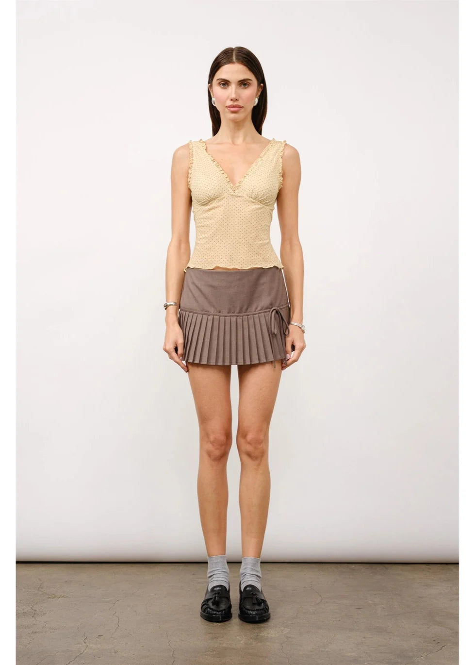 Soft girl energy, but make it vintage. The Polka Dot Top features a delicate mesh feel with allover micro dots, a flattering deep-V neckline, lettuce-edge hem, and playful ruffle straps. Bonus? It comes with a matching headscarf so you can tie your whole look together—literally.