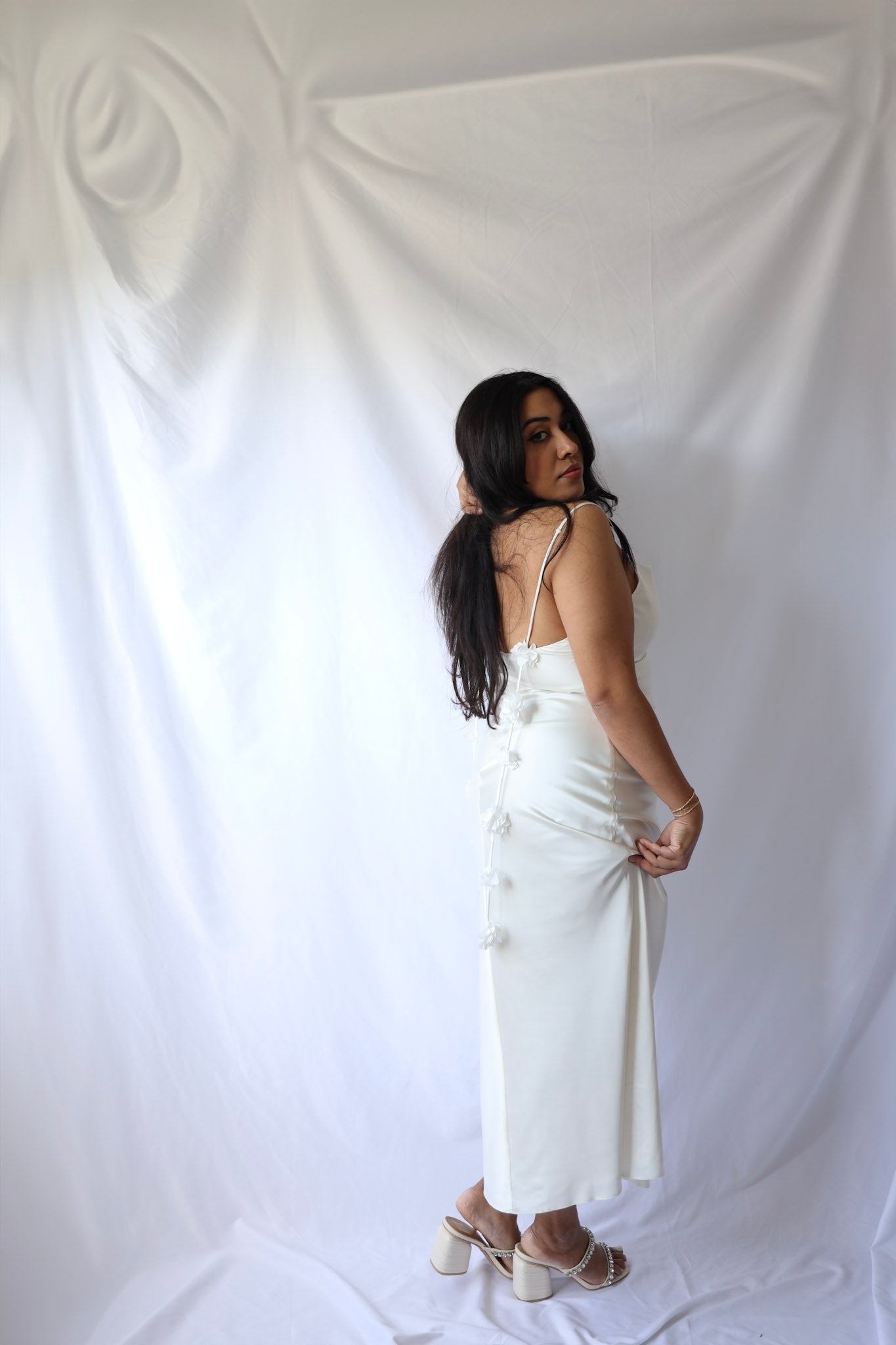 Dance the night away in this charming satin slip dress adorned with delicate rosette detail. Perfect for your bridal shower or bachelorette party, this midi dress will have you feeling elegant and carefree. Say 'I do' to this must-have dress! (Wedding pun intended.)